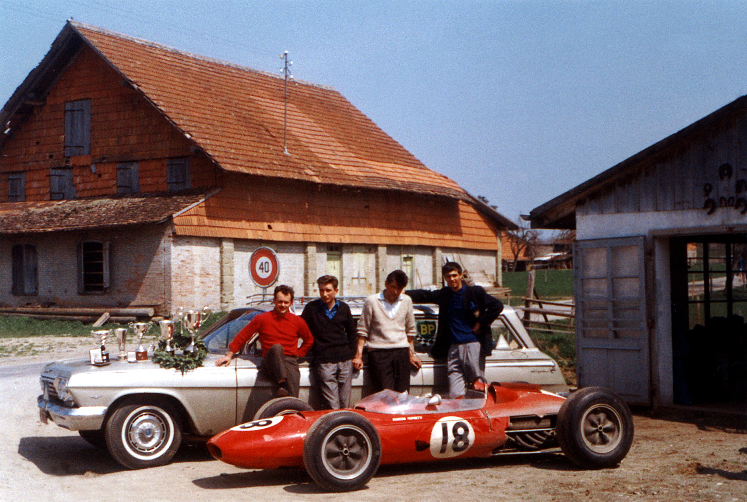 Le châssis est tordu, il doit être redressé et ressoudé avec soin ; mais au moins le moteur n’a pas trop souffert de cette sortie de piste. Les suspensions remontées, l’auto est à nouveau opérationnelle pour courir une semaine plus tard à Imola. Seppi terminera deuxième derrière Jim Clark. Et quatre jours plus tard (toujours hors-championnat du monde), il s’imposera sur le circuit de Syracuse (Sicile) avec sa Lotus 24 BRM. Le 30 juin 1963 Jo Siffert termine 6ème à Reims du GP de France (ACF) et marque 1 point ! Son premier dans le cadre du championnat du monde. Il faut rappeler, comme le dit sobrement Heini, que ce team de très petite taille fait des miracles parmi les écuries des usines, avec bien des sacrifices et des repas très frugaux. Lors des voyages à travers l’Europe, du temps du break Chevrolet et de la remorque tractant la monoplace, les vergers traversés fournissaient d’excellents fruits qui amélioraient les récurrents spaghettis ! Ils dormaient dans la voiture ou à côté. Jean-Pierre Oberson qui craignait les animaux nocturnes dressant même son lit sur la galerie du break ! Le peu d’argent des primes de départ et si possible de classement ne permettaient que de payer le carburant et des rares pièces détachées. Un train de pneus durait quatre courses, essais compris !